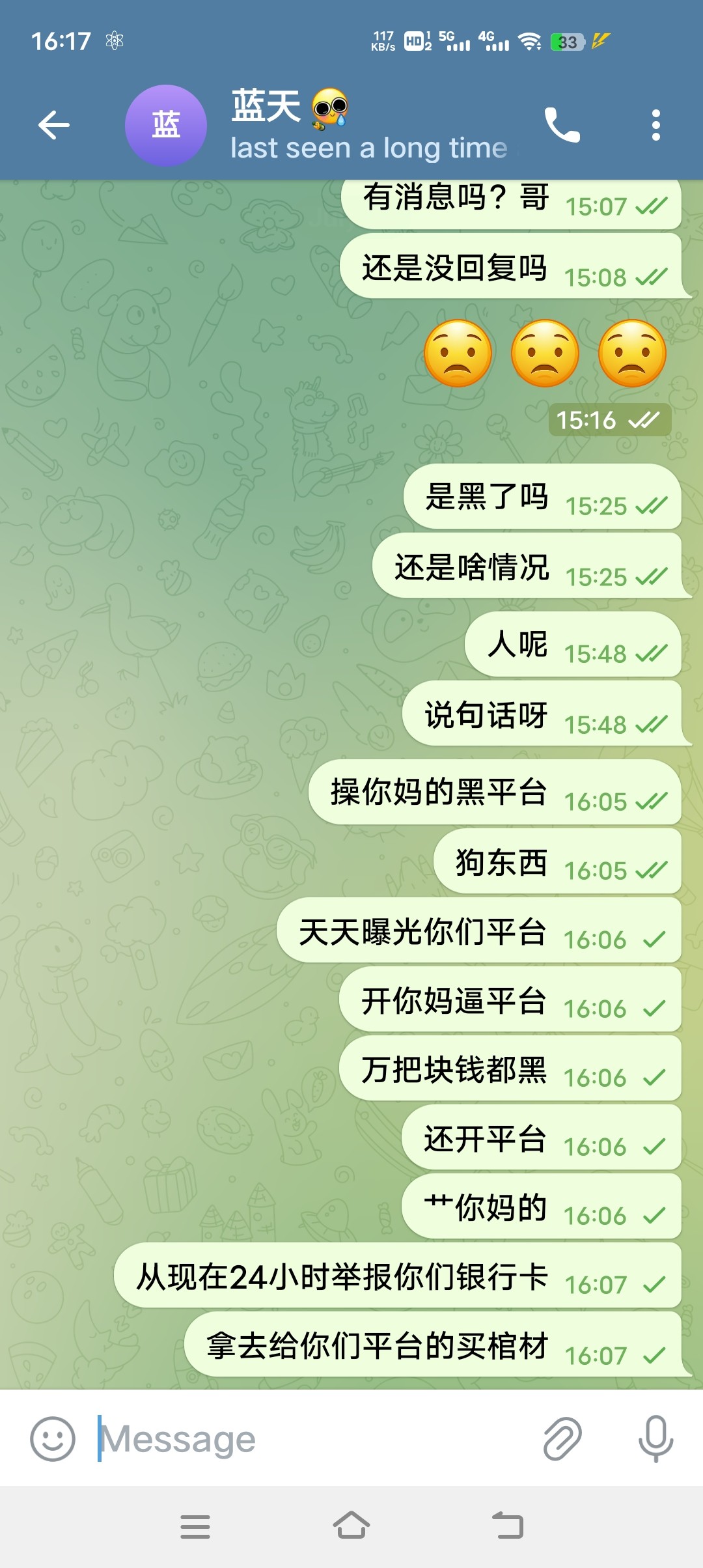 7767...9099这两个域名的威尼斯人是黑台子,飞机上客服管理员名字蓝天,大家记住了千万别去玩,看图。我之前一直输,19号500打到2.8,之前出了,后面号里加起来还有2个多都被黑了,客服之前一直说审核注单。今天查到我没问题,什么都不说直接就把我黑了。在玩的兄弟们趁早走。飞机群经常有人被黑。都是这个平台。