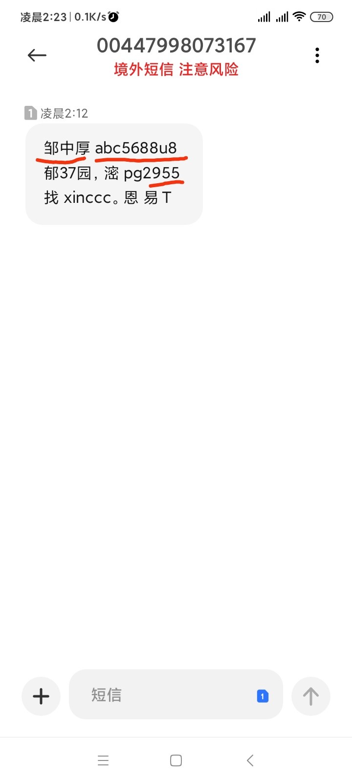 然后这个信息用自己手机给自己手机号发一下,然后截图下来,最后再P个境外短信号码就行了。