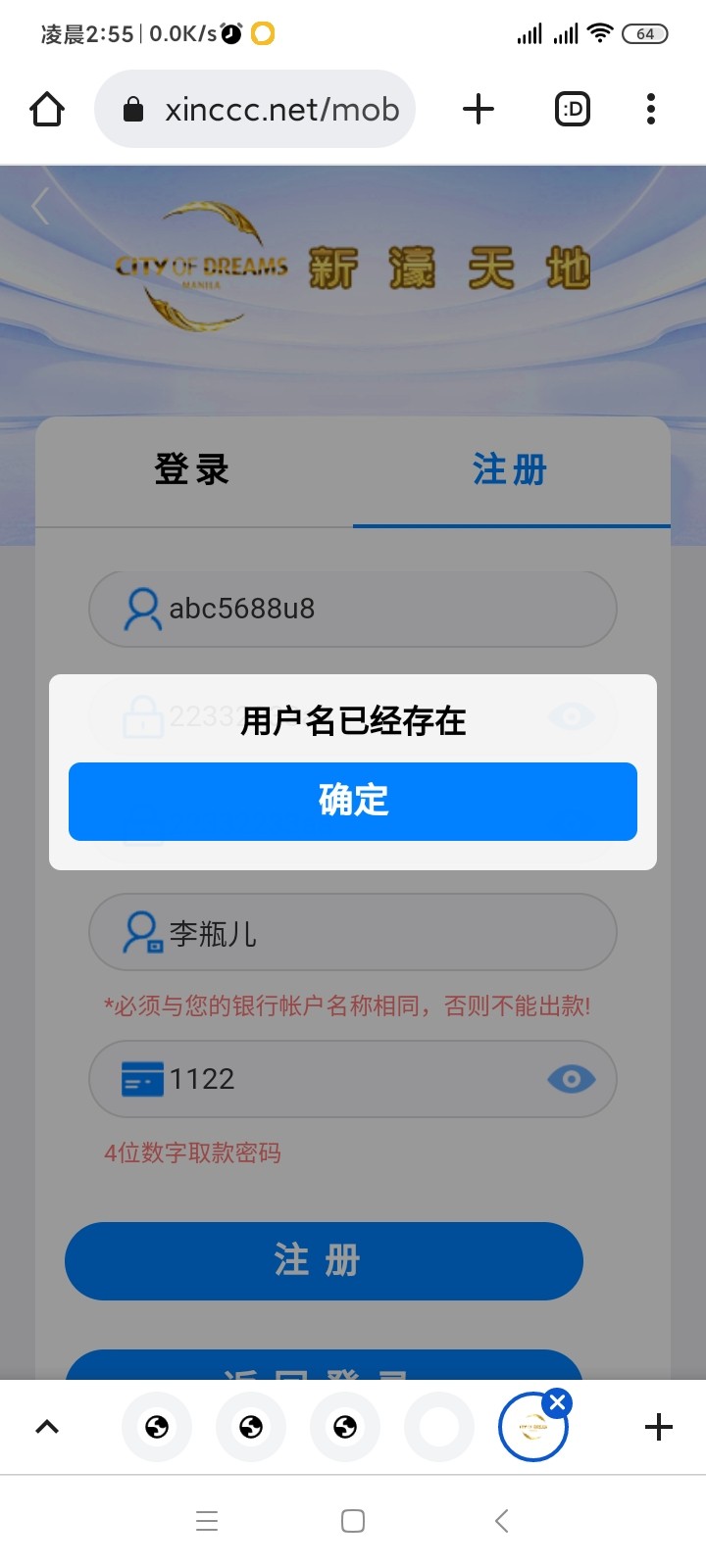 第二步 如下图,点注册 ,注册的用户名写你以前各网站常用的用户名,当然了不行也可以更换有可能自己的其他用户名,记住不是让你真注册,用户名下面登录密码随便写,然后下面姓名不要写自己的,真实姓名也是随便写(本就不是真注册,即使真注册成功也不影响自己换IP继续登录或者注册),然后下面的取款密码一定要写简单的1122或者2233这样的(后面解释),然后注册,如果显示用户名已存在,那么恭喜你,可能就是你账户了,(复杂账户名是你的可能可能性更大,这不用解释了吧)。