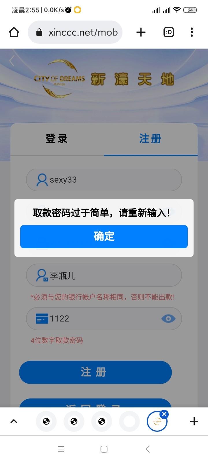 如果用户名没注册过 就会如下图显示取款密码过于简单,这就代表没有注册过,懂了吧?没有注册过也不要徒劳注册了,可以更换其他用户名尝试,如果实在没有,那就忽略即可。