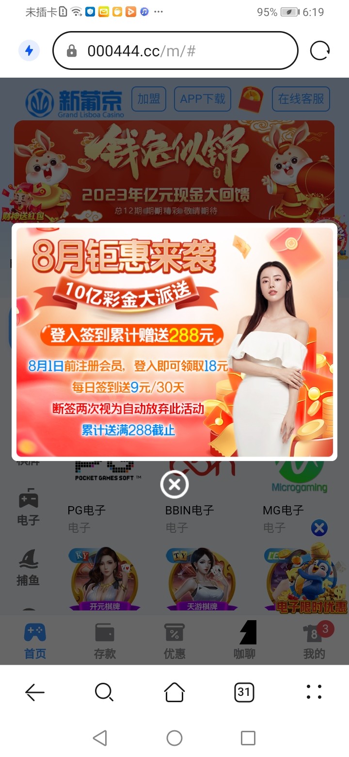 新葡京8月1号之前有号的都可以登录上去领取18元彩金,页面会自动跳出红包点击就行,然后右上角的签到按钮签到有9块钱,每天都能签到,签到满288彩金就签到不了了