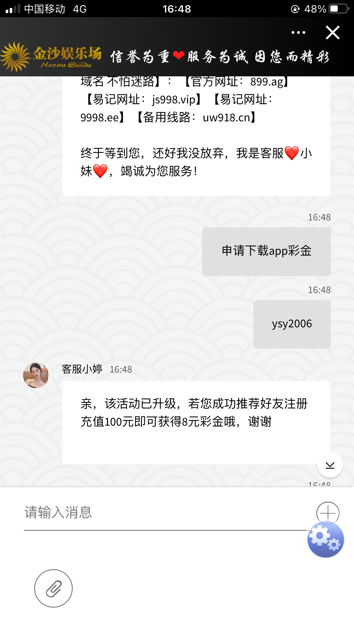 新用户注册绑卡必须下载app然后联系在线客服把账号和下载好app的截图一起发给他 秒送8元彩金 无游戏限制 最低提款128元