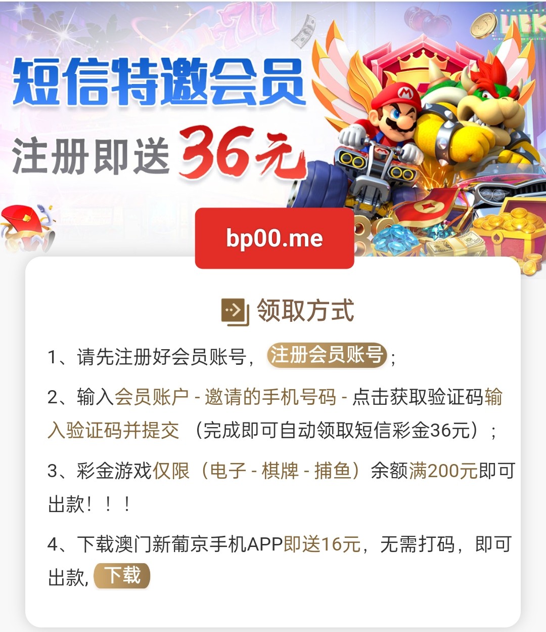 碰瓷特邀!先注册好账号在去申请,限制:电子/捕鱼/棋牌 最低提款:200元