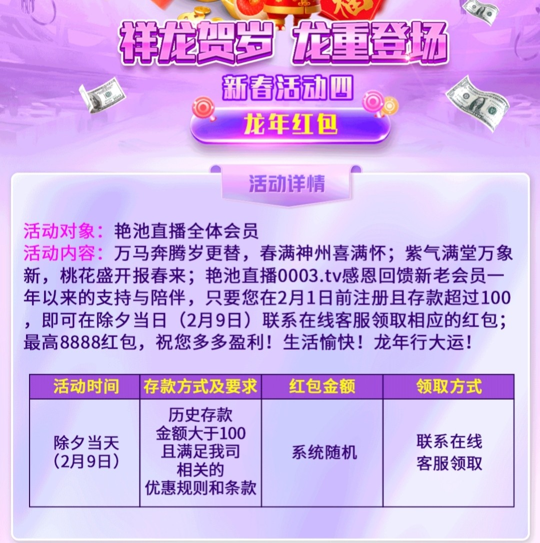 历史充值满100+联系客服申请龙年红包回馈