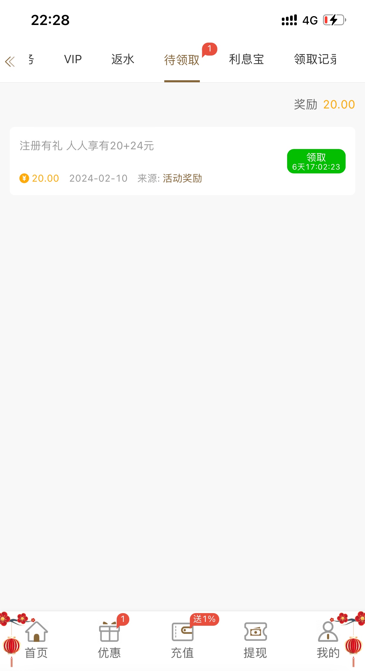 注册没有充值的 也可以领个20 要200提
