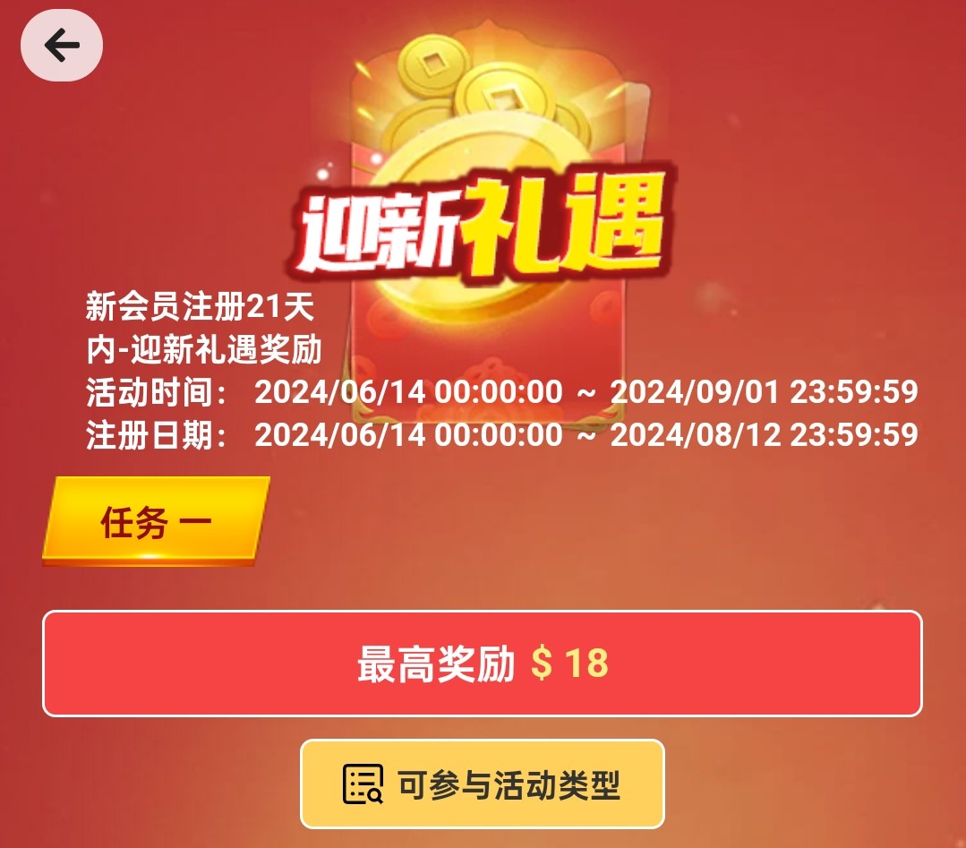 注册绑定银行卡,在会员中心活动专区里面,免费签到,迎新礼金送18但是得有效投注8元,可以用签到的彩金打!