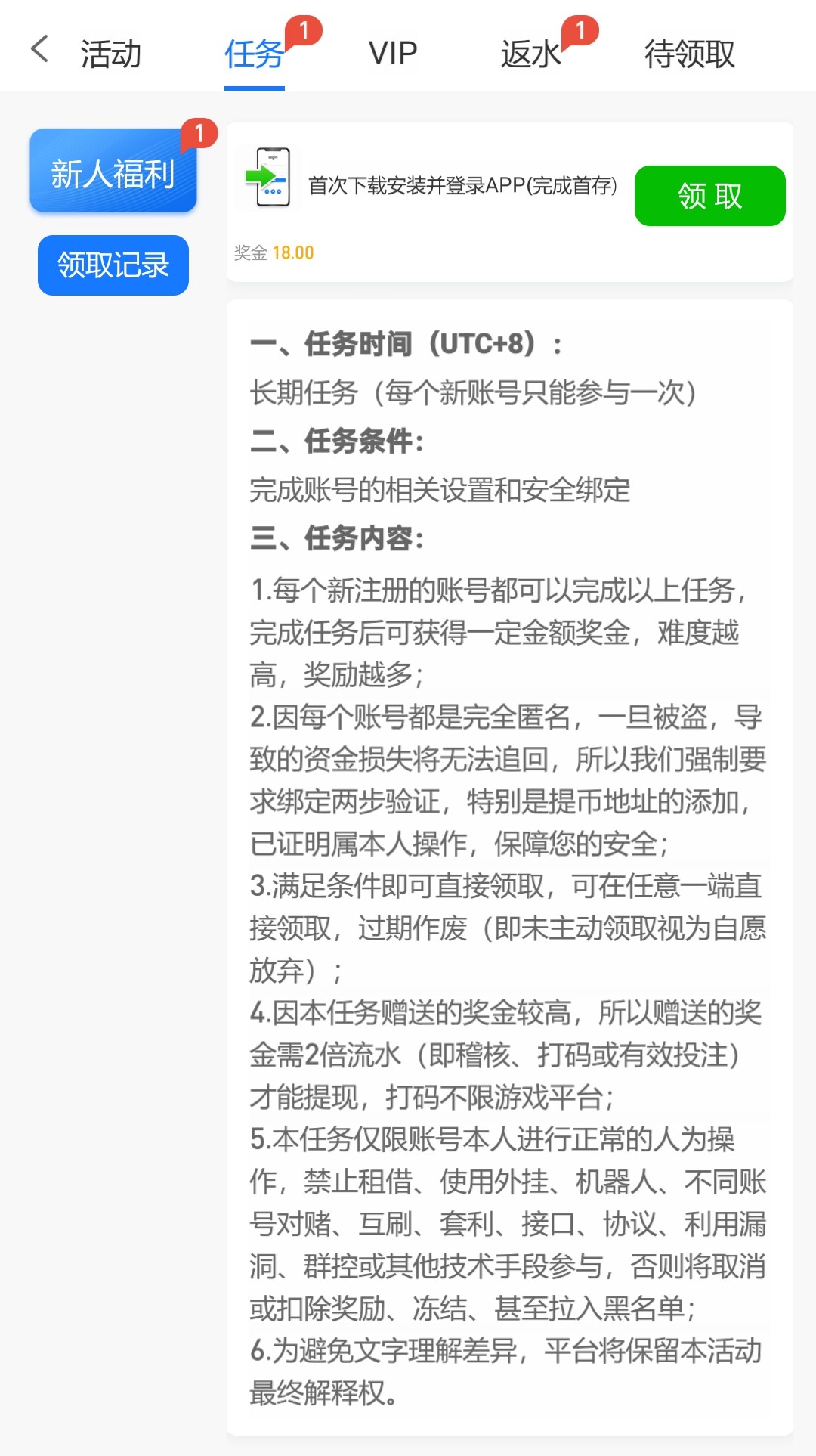 首存过的下载APP送18,在任务中心领取,2倍流水,最低100取款,没有游戏限制!