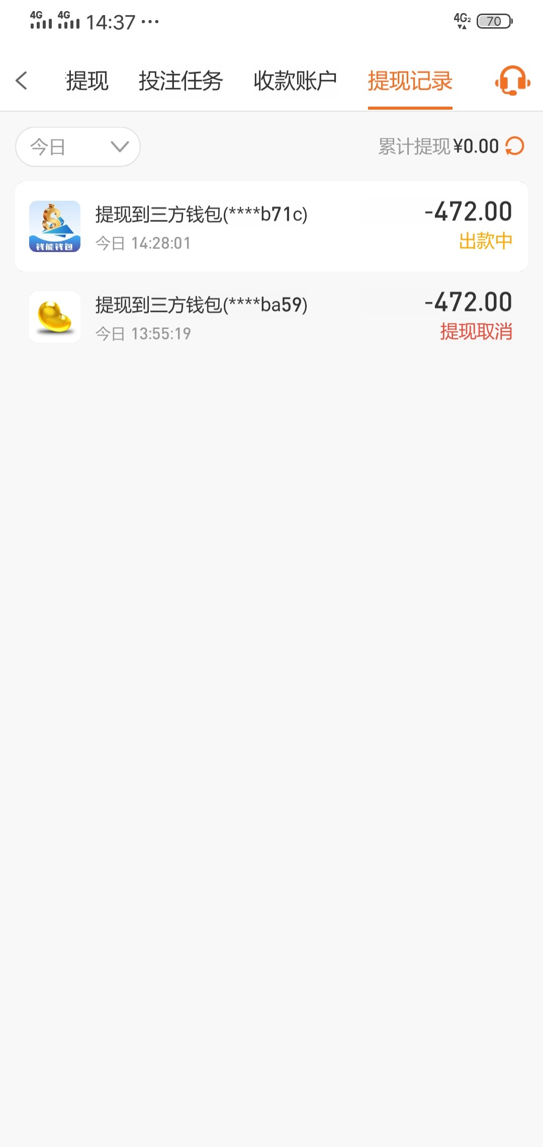 统一回复一下,昨天下午打到1180提现3个小时给我取消了,让后我又用朋友的钱能提,结果不同名,又给我取消了,然后又用银行卡提,给我来个最多只能提560,我就把多余的560,都买免费了,又提钱能,两个多小时到账了,没有充值!没有充值!