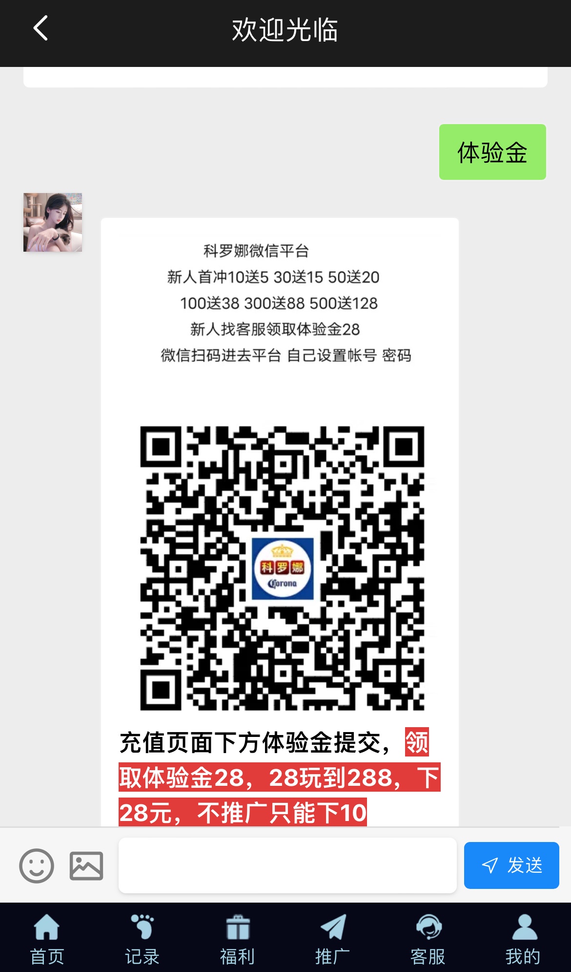 微信扫码用微信登入然后在充值那里有个体验金领取点一下就行了,28打到288下10现金