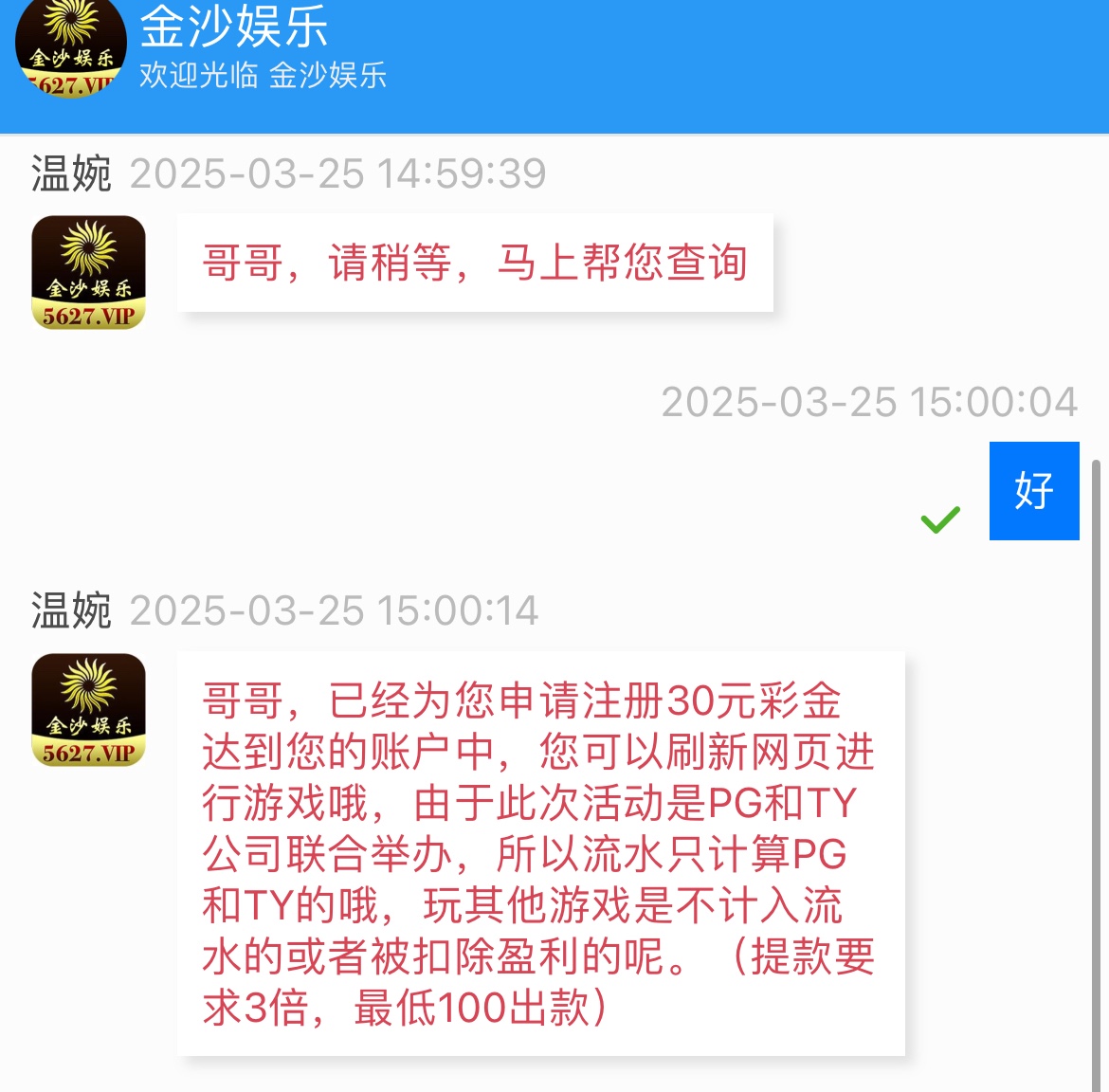 注册复制ID联系客服,发ID和手机号等客服回复说电话彩金换着来,送38彩金,3倍流水,限PG/TY电子,最提现100