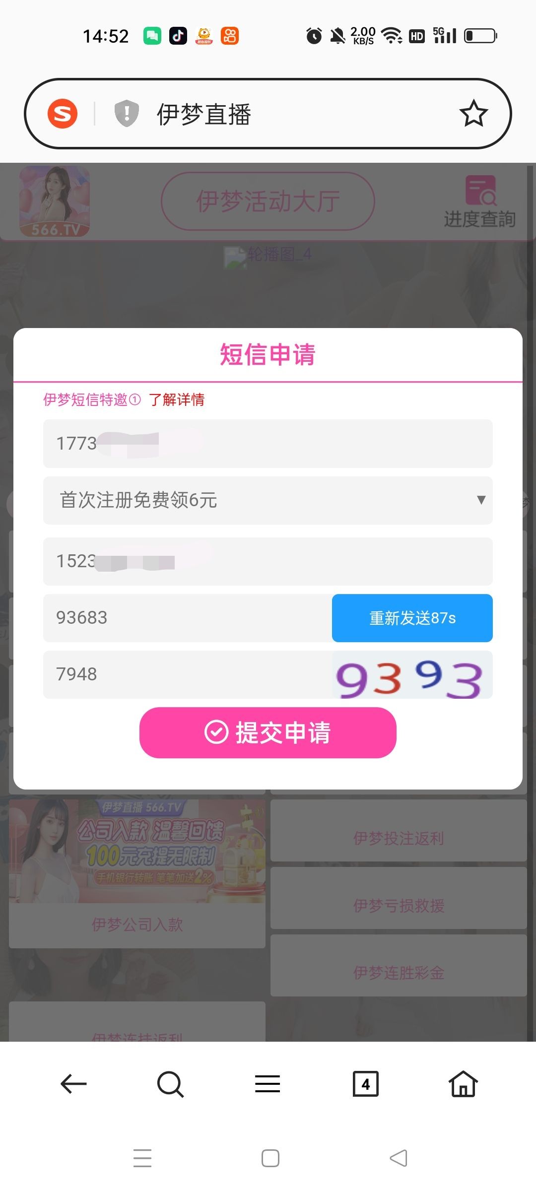 新人注册送6,自助申请,查不查短信特邀不清楚,自己碰瓷试试