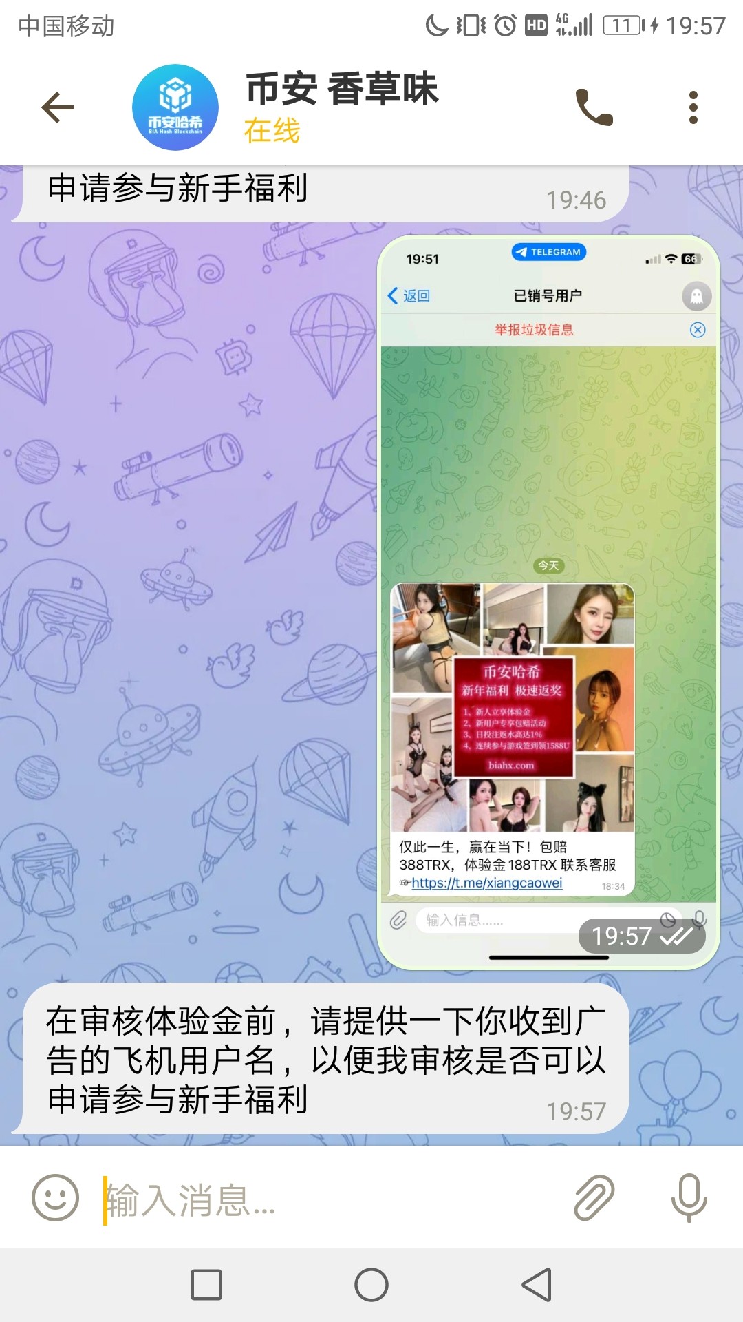 在审核体验金前,请提供一下你收到广告的飞机用户名,以便我审核是否可以申请参与新手福利