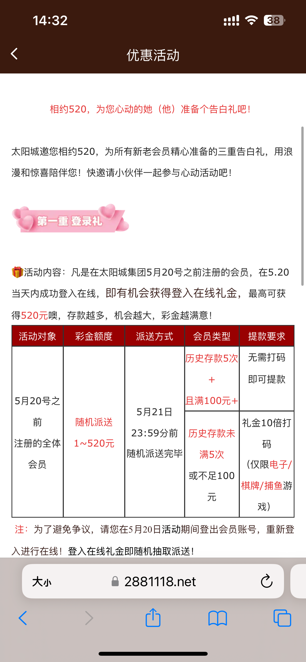 【太阳城】520登陆彩金